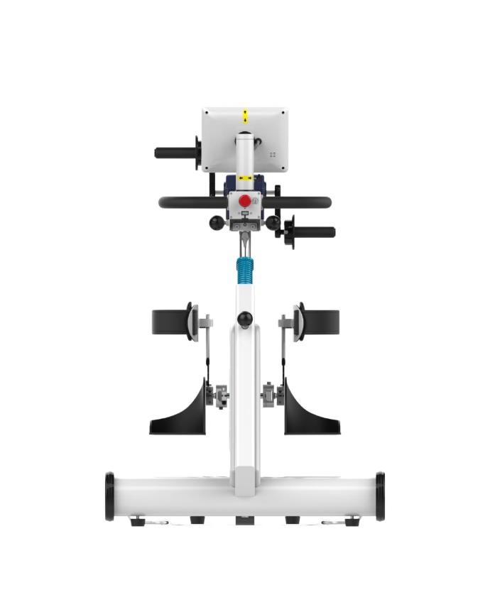Pédalier motorisé MedUp V3 (Actif/Passif) pour membres supérieurs et inférieurs. Cette configuration améliorée comprend: guides pour les jambes, moufles, crochets anti-bascules pour fauteuil roulant, bouton d'arrêt d'urgence, ainsi qu'un ensemble de poignées (standards et thérapeutiques).